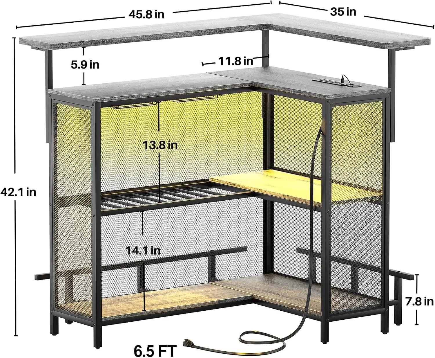 - High-Quality Board & Sturdy Structure: The home bar is constructed of high-grade MDF board and a thickened steel frame. The L-shaped design and front footrest stand to ensure safety and stability. This coffee and wine bar is long-lasting use and you can believe it to be a favorite bar furniture for years to come. The corner bar can be used as wine cabinet, coffee bar in the dining room, basement, kitchen, or office space. Dimension: 45.8″ L x 35″ W x 42.1″ H.