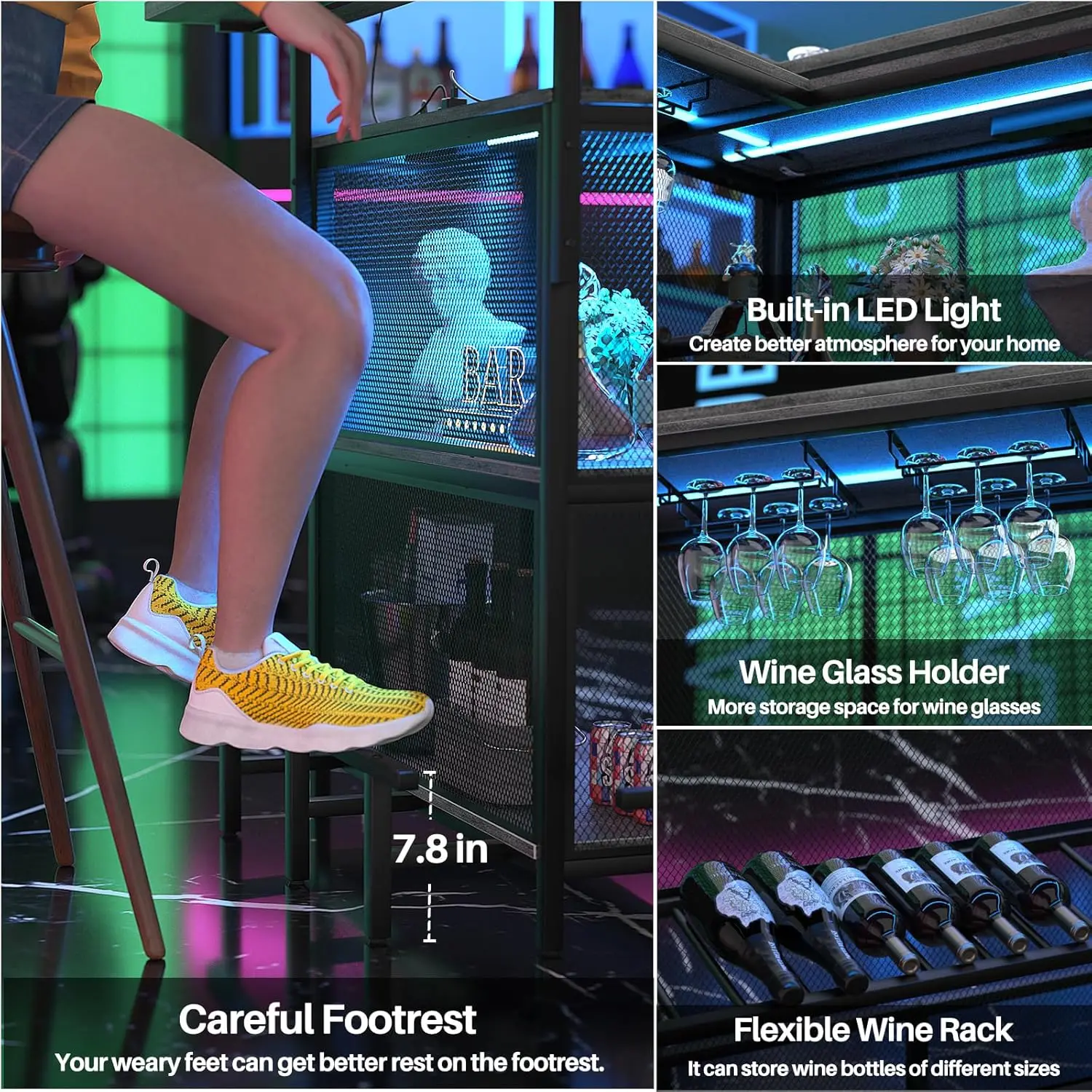 - Wine Cabinet with Ample Storage: The L-shaped home bar unit comes with four levels of large capacity. In the top two tiers, you can place a coffee maker and other lighted decorations. The power strip supplies power for these easily. In the center tier, 4 cup holders can hang 12 wine glasses and the wine rack can store different shapes of wine that glows and charming under the light. In the bottom tier, you can store some whiskey, plates, mixers and other collectibles.